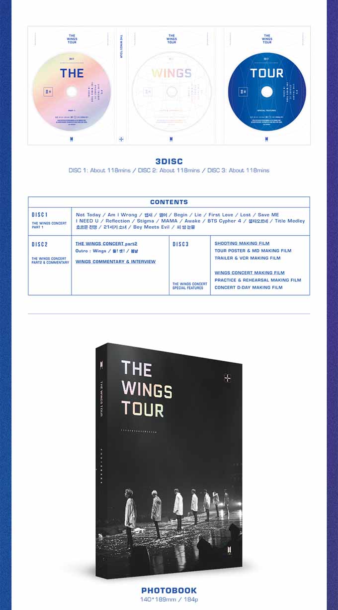 Track ListDISC 1 : THE WINGS CONCERT PART 1 Not Today Am I Wrong 뱁새 쩔어 Begin Lie First Love Lost Save ME I NEED U Reflection Stigma MAMA Awake BTS Cypher 4 불타오르네 Title Medley 호르몬 전쟁 21세기 소녀 Intro : Boy Meets Evil 피 땀 눈물