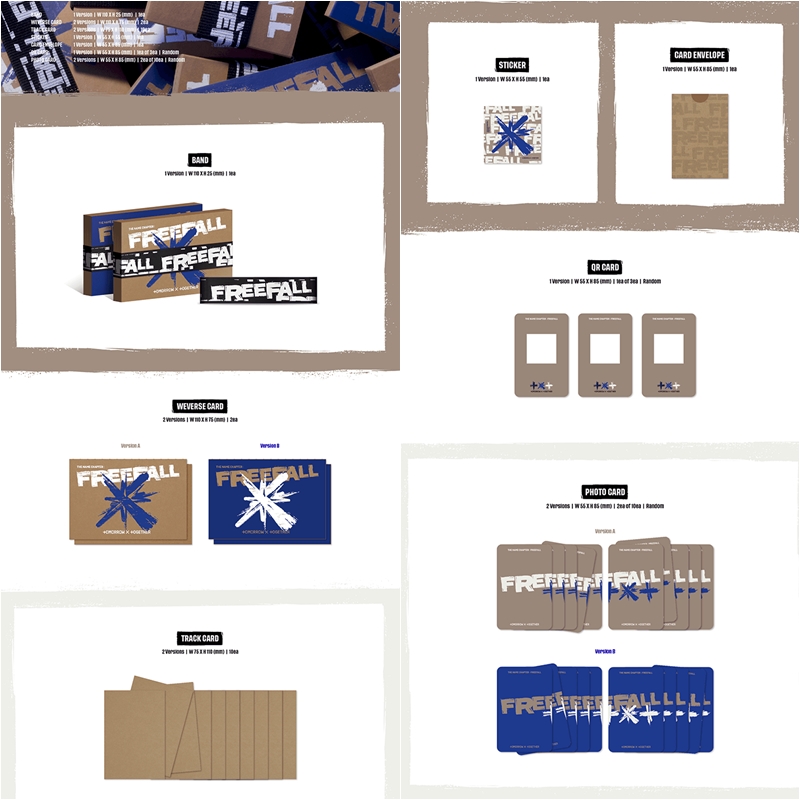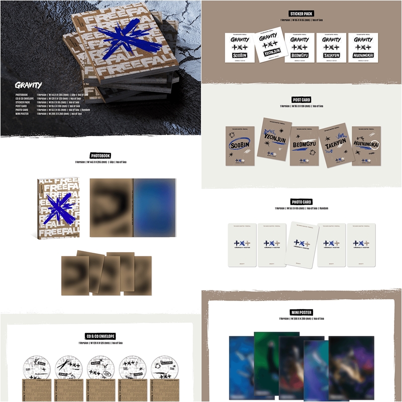 · Paper Band: 1 type / W110 x H25 · Weverse Card: 2 types per version / W110 X H75 · Track Card: 10 types per version / W75 x H110 · Sticker: 1 type / W55 x H55 · Card Envelope: 1 type / W55 x H85 · QR Card: Random 1 out of 3 types / W55 x H85 · Photocard: Random 2 out of 10 types per version / W55 X H85 Product DetailsPackage(GRAVITY / Random Ver.)